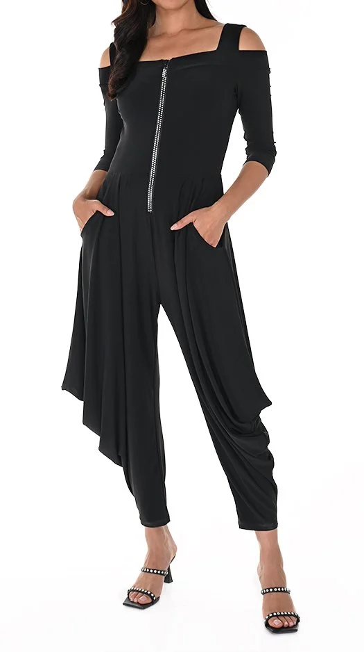 A woman wearing a sleeveless black top with a high neckline and black pants.