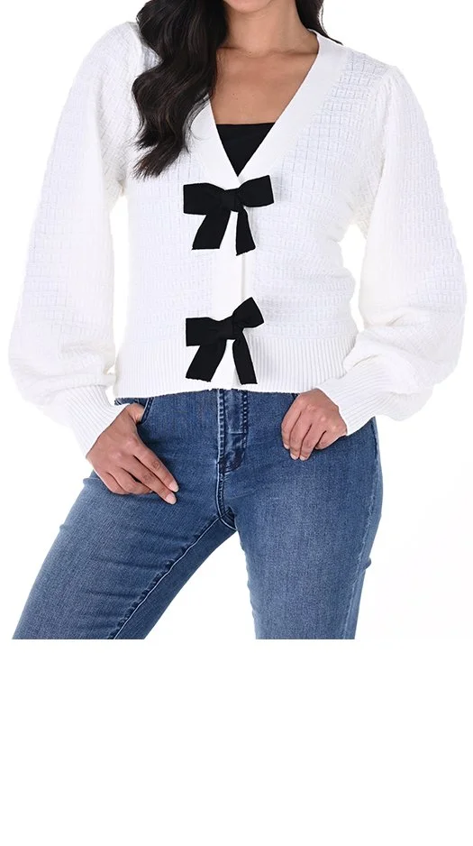 Woman wearing a black knit sweater with white cloud patches and polka dots, paired with black pants, standing against a light gray background.