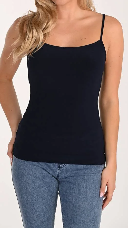Woman wearing a navy blue sleeveless tank top and matching pants, standing with hands on her hips.